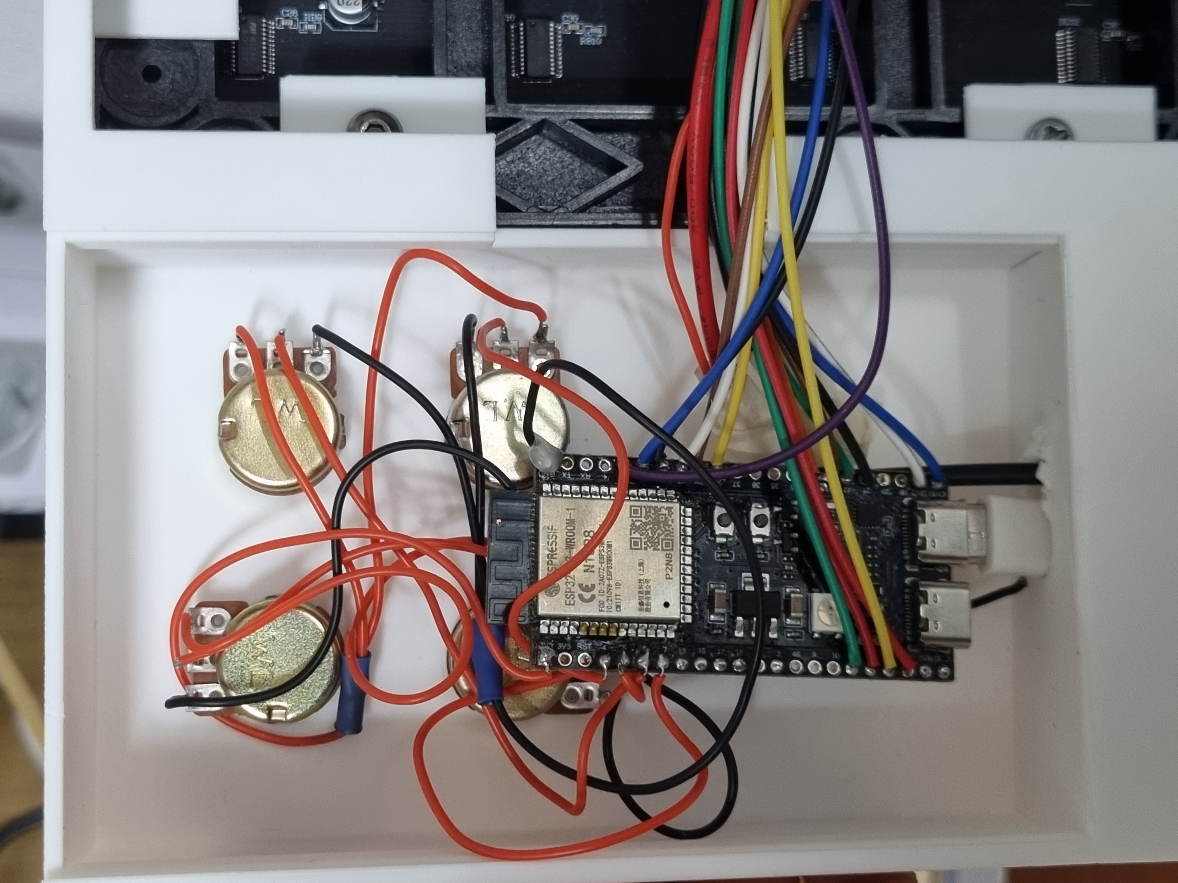 Nothing got better, no matter what I tried. Was the ESP32 broken? The LED matrix? I started suspecting everything. Hardware is maddening — you can't tell where the fault is. I couldn't keep guessing at solder joints. So I went back to the beginning and tested each component individually. There it was. The potentiometer was the cause. The serial log was throwing wild values. Swapping in a different one fixed it instantly. When I told Doyun, he was surprised. He said it's actually hard to break a potentiometer. I think I'd just blasted it too many times during my soldering rampage.