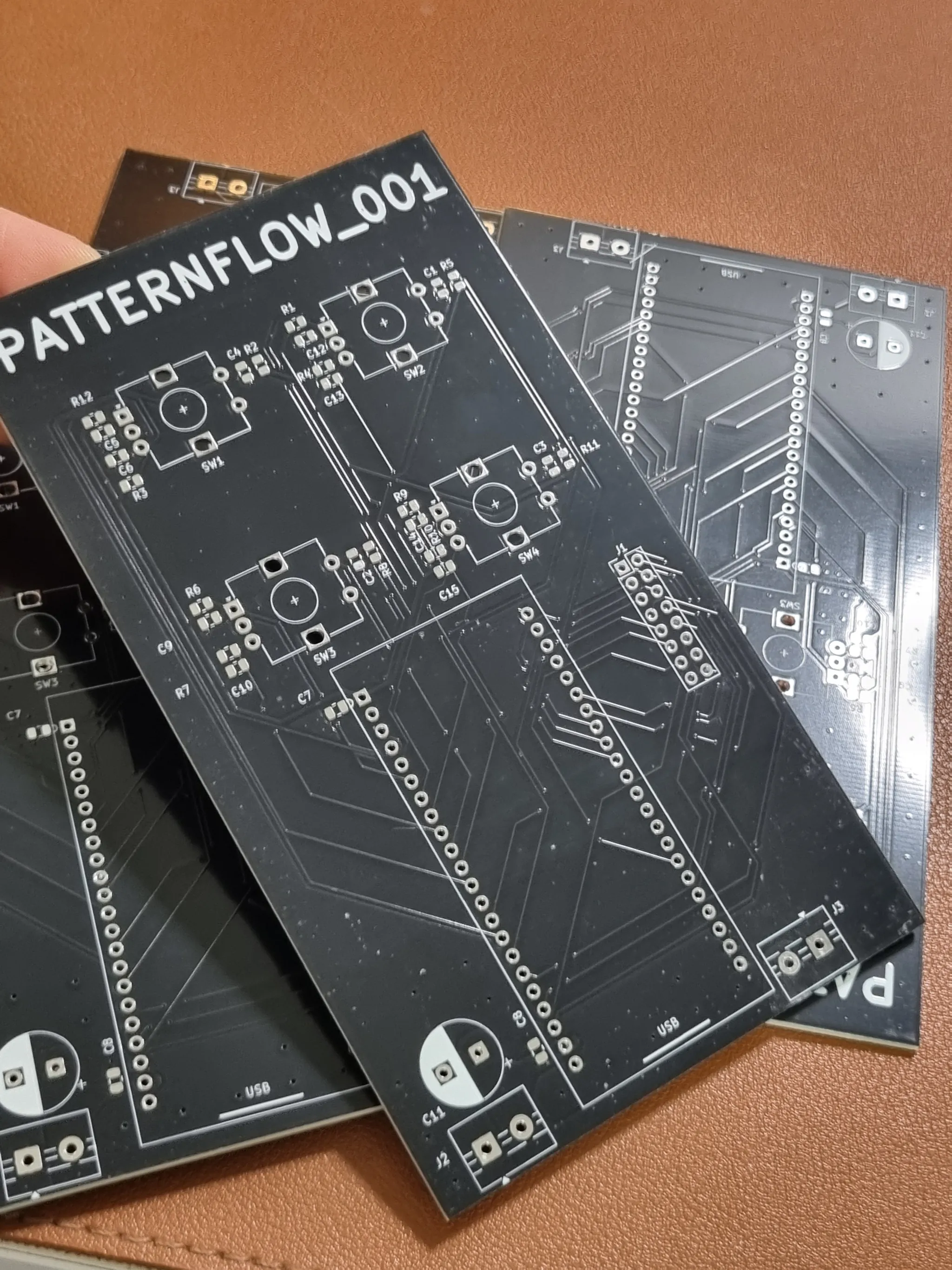 Ordering was almost embarrassingly simple. You upload the Gerber files and it sets everything up for you. You can pick the color. I'd heard other PCB houses charge extra for black, but here it was free, which was nice. The shipping options ranged from fast and expensive to slow and cheap. Since this was sponsored, I picked cheap. Even so, it arrived in three days. Much faster than I'd expected. The PCB that arrived was beautiful — much better than it looked on screen. So good. Seeing the silkscreen "patternflow" text, I really felt that I had made my first PCB.
